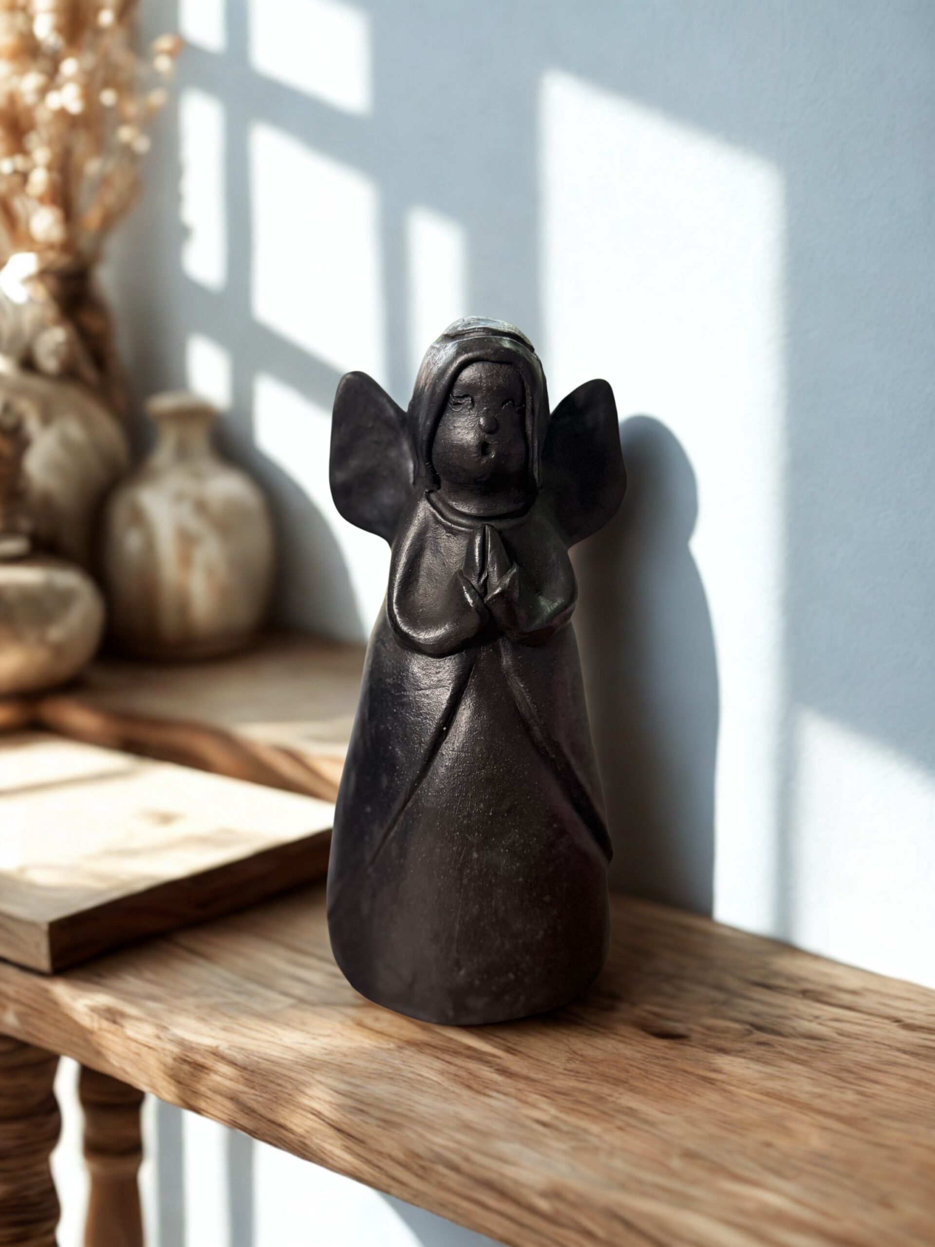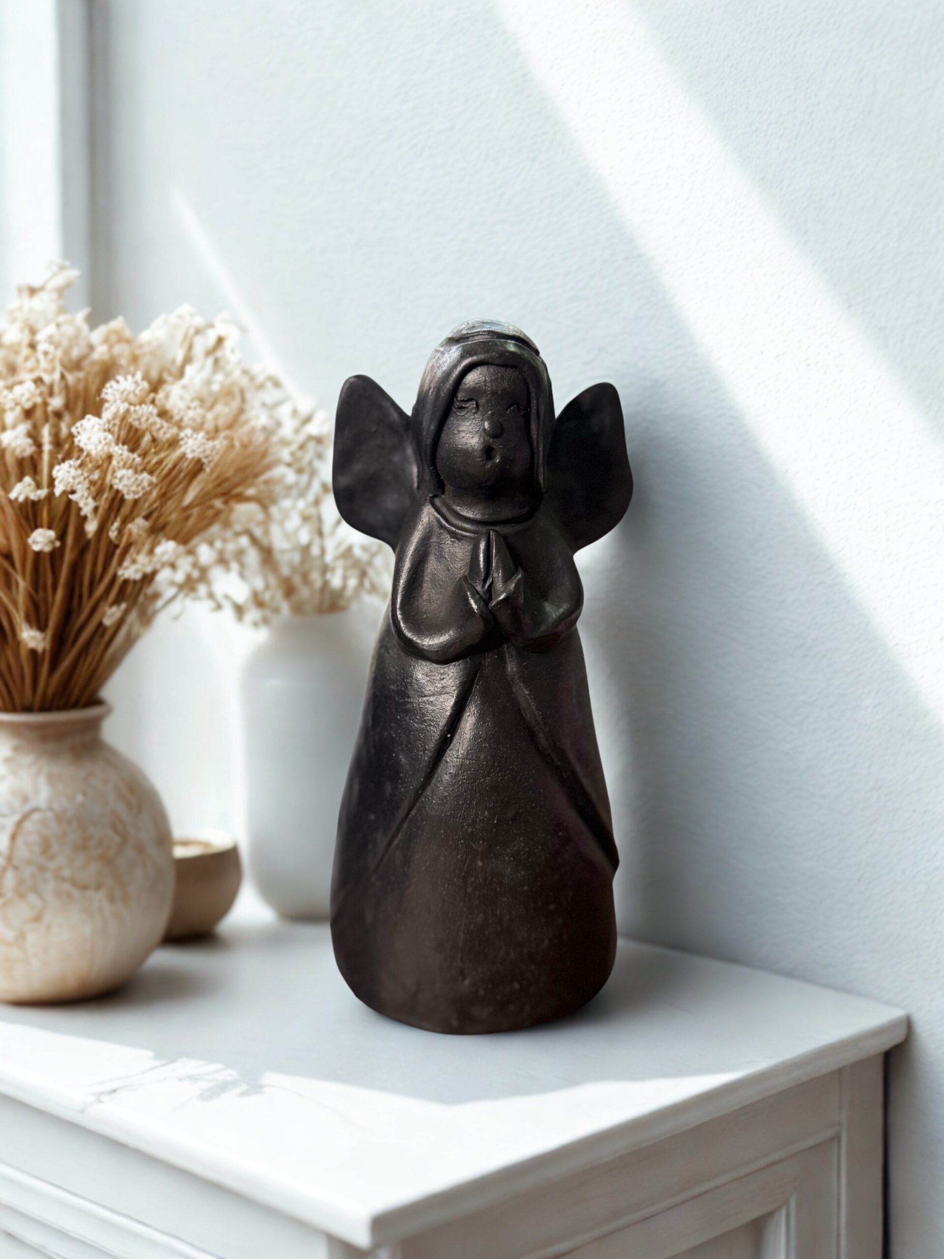 El ángel de cerámica artesanal es una pieza decorativa única, modelada y pintada a mano por artesanos paraguayos. Presentado en una caja premium, es una opción ideal para regalar o para dar un toque cálido y espiritual a cualquier espacio del hogar.