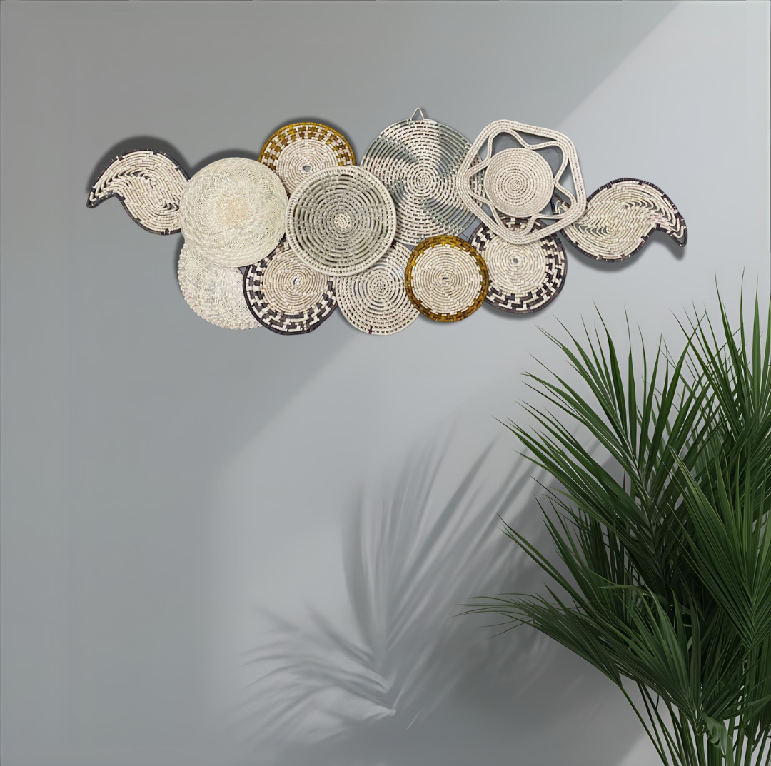 Este mural artesanal es una verdadera obra de arte hecha a mano, compuesto por varias piezas que, al unirse, forman una imponente decoración de 1,70metros aproximadamente de largo. Cada detalle está trabajado con fibras naturales en tonos beige y marrón, lo que aporta calidez, armonía y un estilo orgánico a cualquier ambiente.