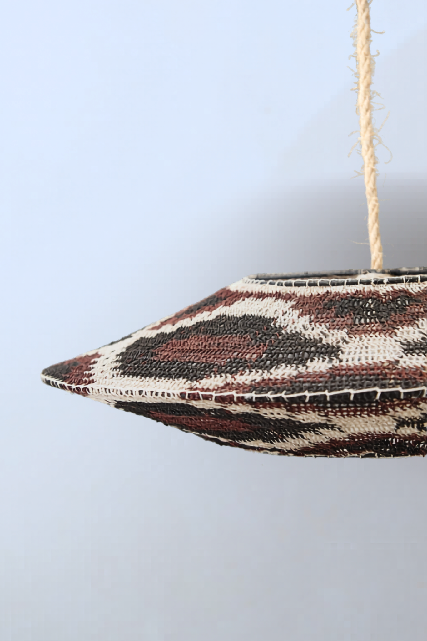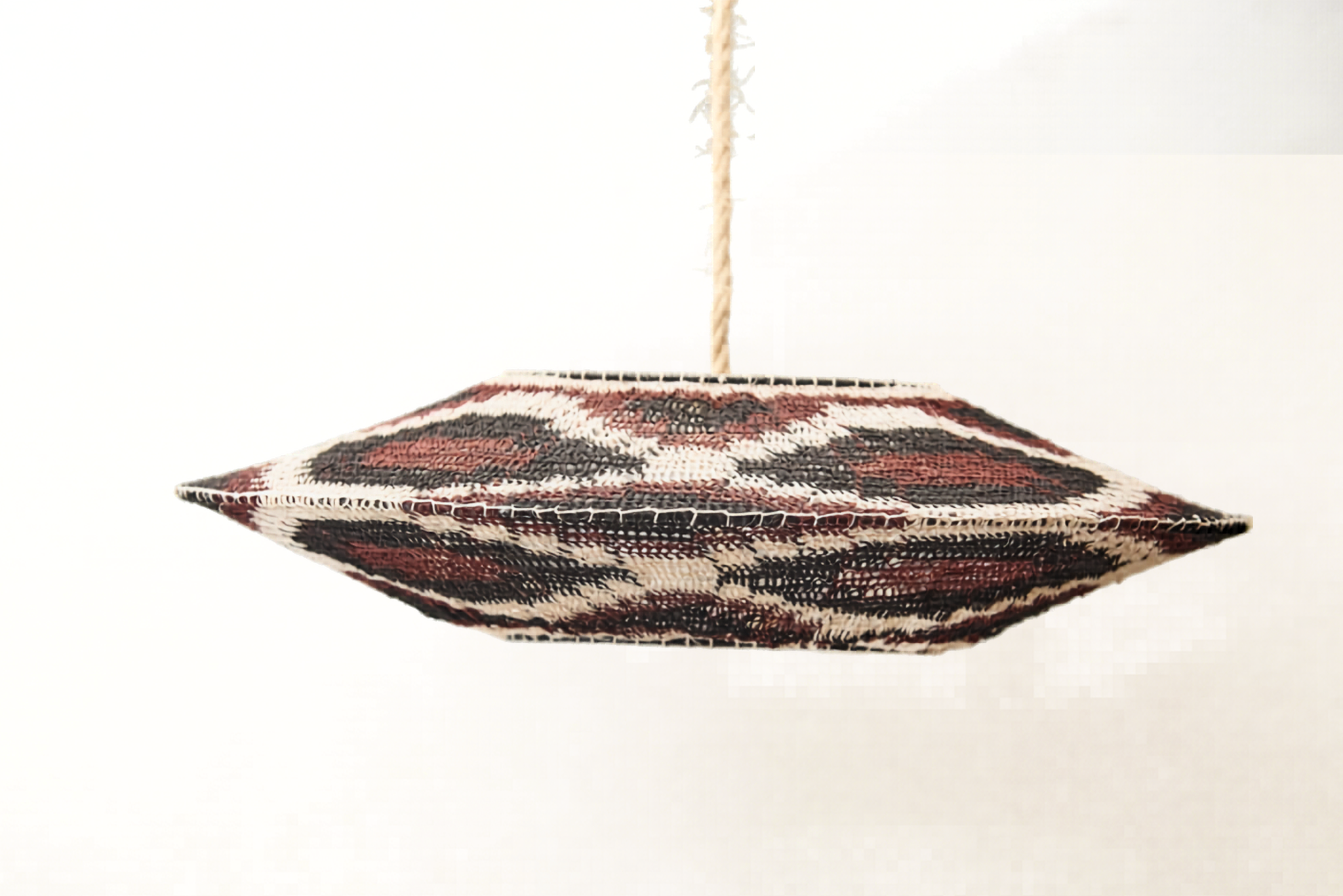 Lámpara artesanal con una fuerte identidad visual. Sus contrastes reflejan la riqueza cultural del trabajo nivaclé.