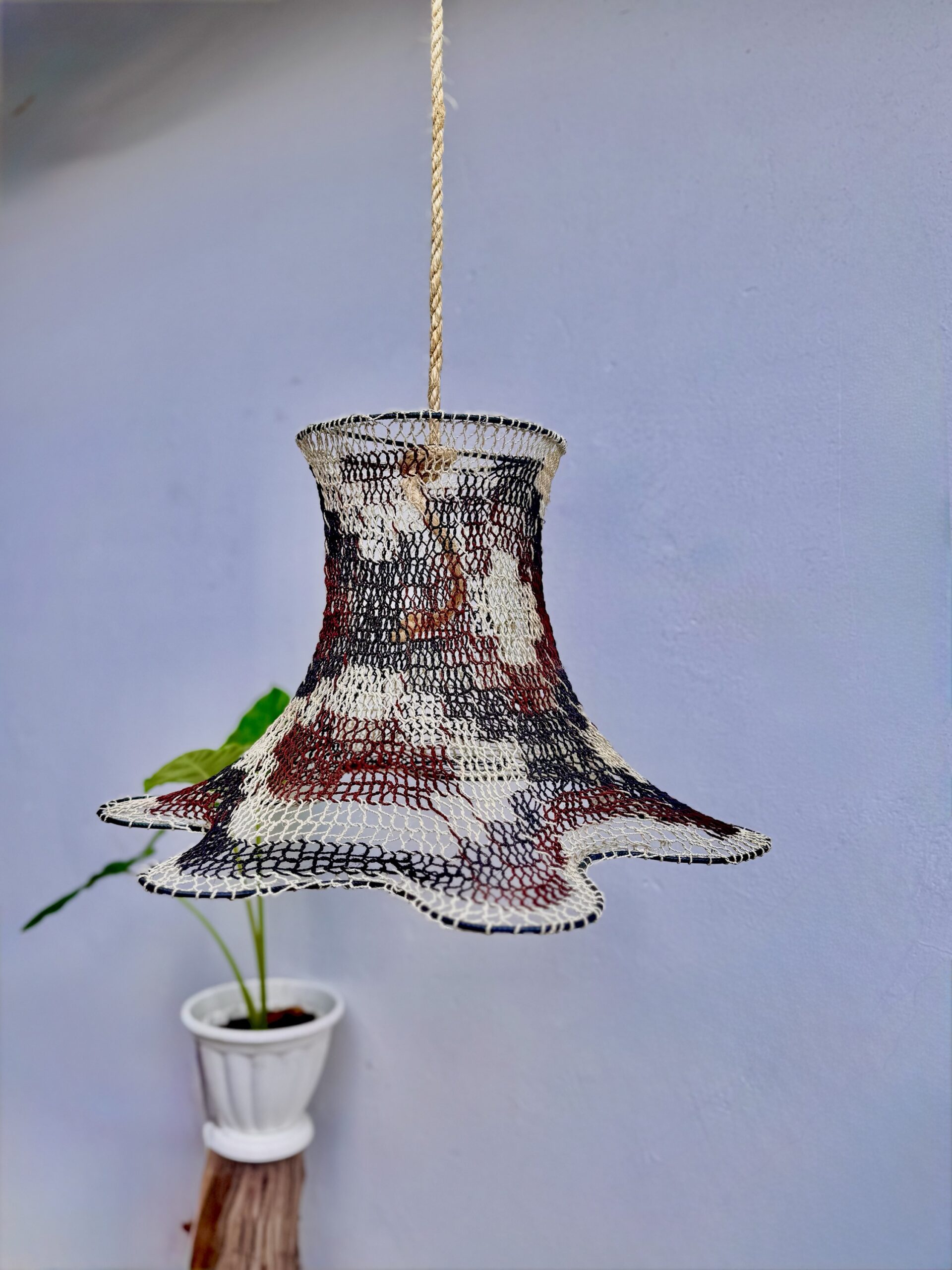 La lámpara colgante está completamente hecha a mano con fibras de caraguatá teñidas artesanalmente y tejidas con técnicas tradicionales por artesanos Nivaclé. Su estructura orgánica suaviza la luz y aporta calidez al ambiente.