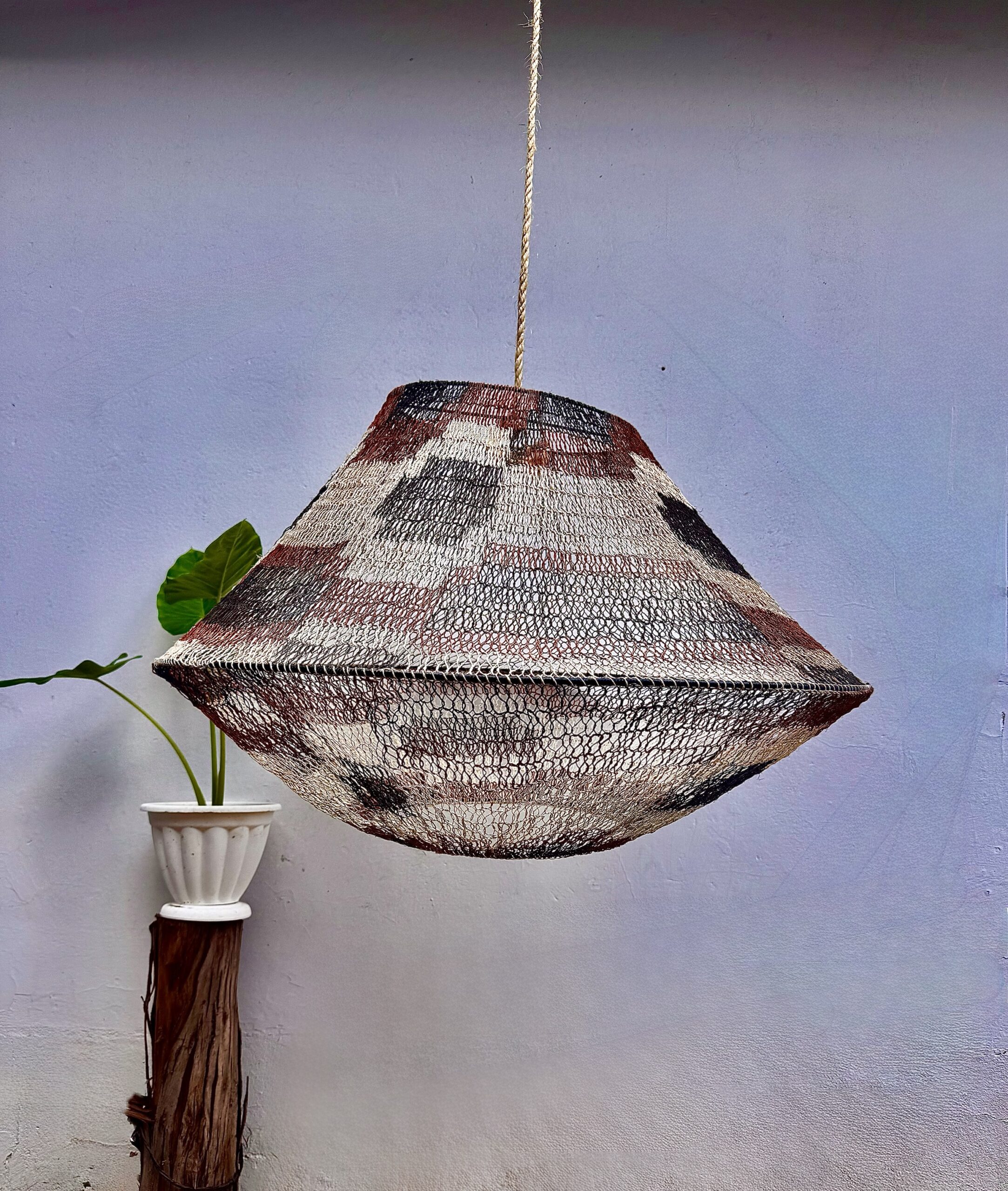 La lámpara colgante está hecha a mano con fibras resistentes de caraguatá por artesanos Nivaclé, combinando fortaleza y elegancia natural. Su diseño tejido genera una iluminación ambiental cálida.