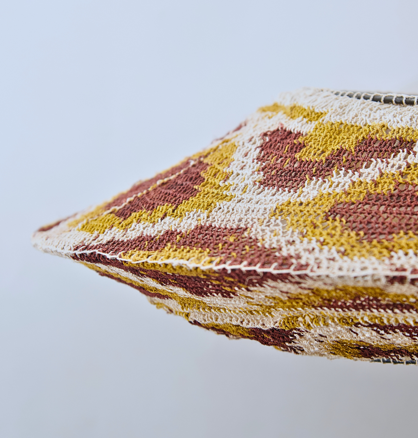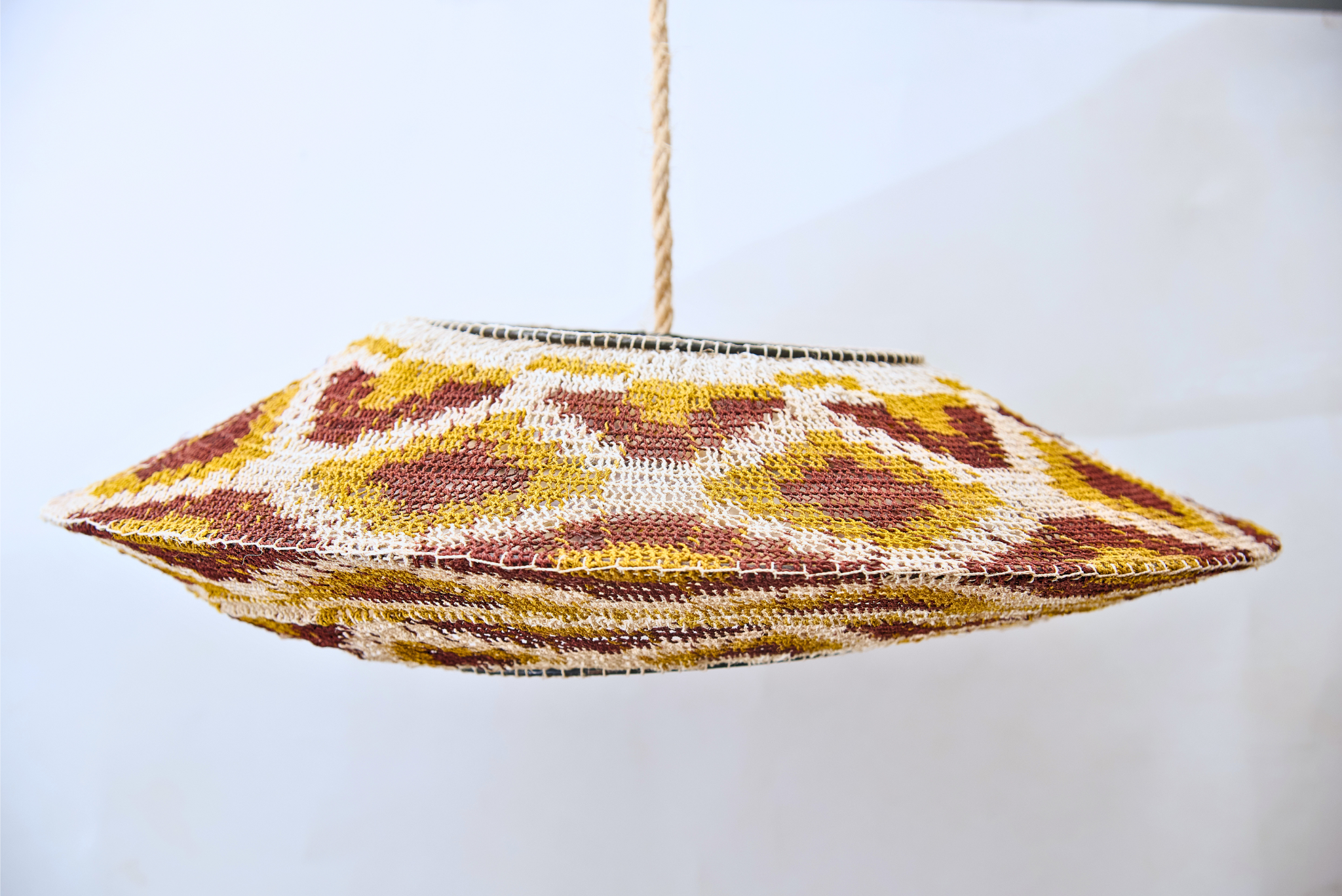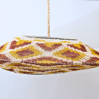 Esta pieza combina tonos naturales con acentos verdes que aportan frescura. Cada lámpara es única, creada a mano con fibras de caraguatá.