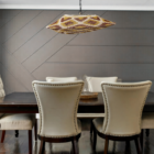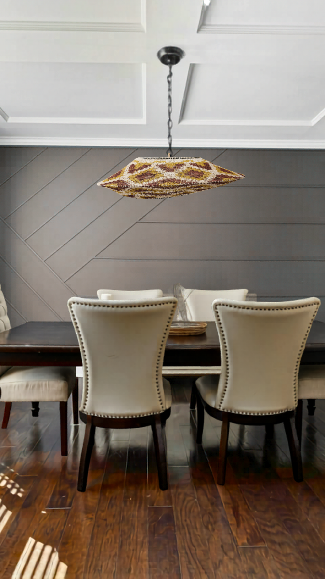Lámpara colgante de 60 cm diámetro x 15 cm alto en tonos verdes, marrones y blancos. Hecha a mano, perfecta para dar frescura a comedores y espacios sociales.