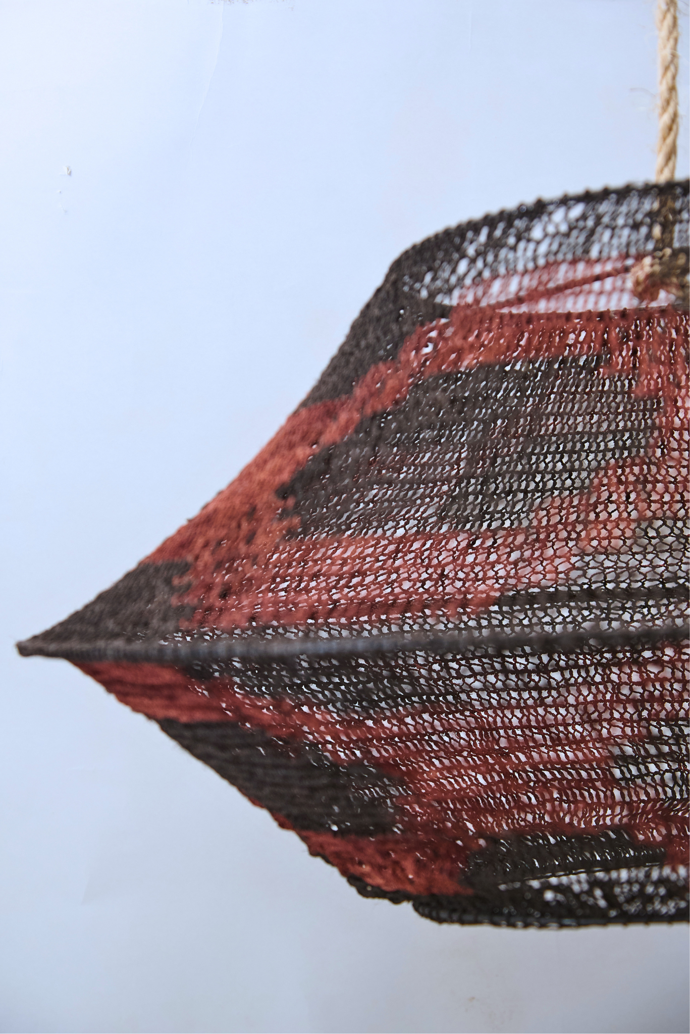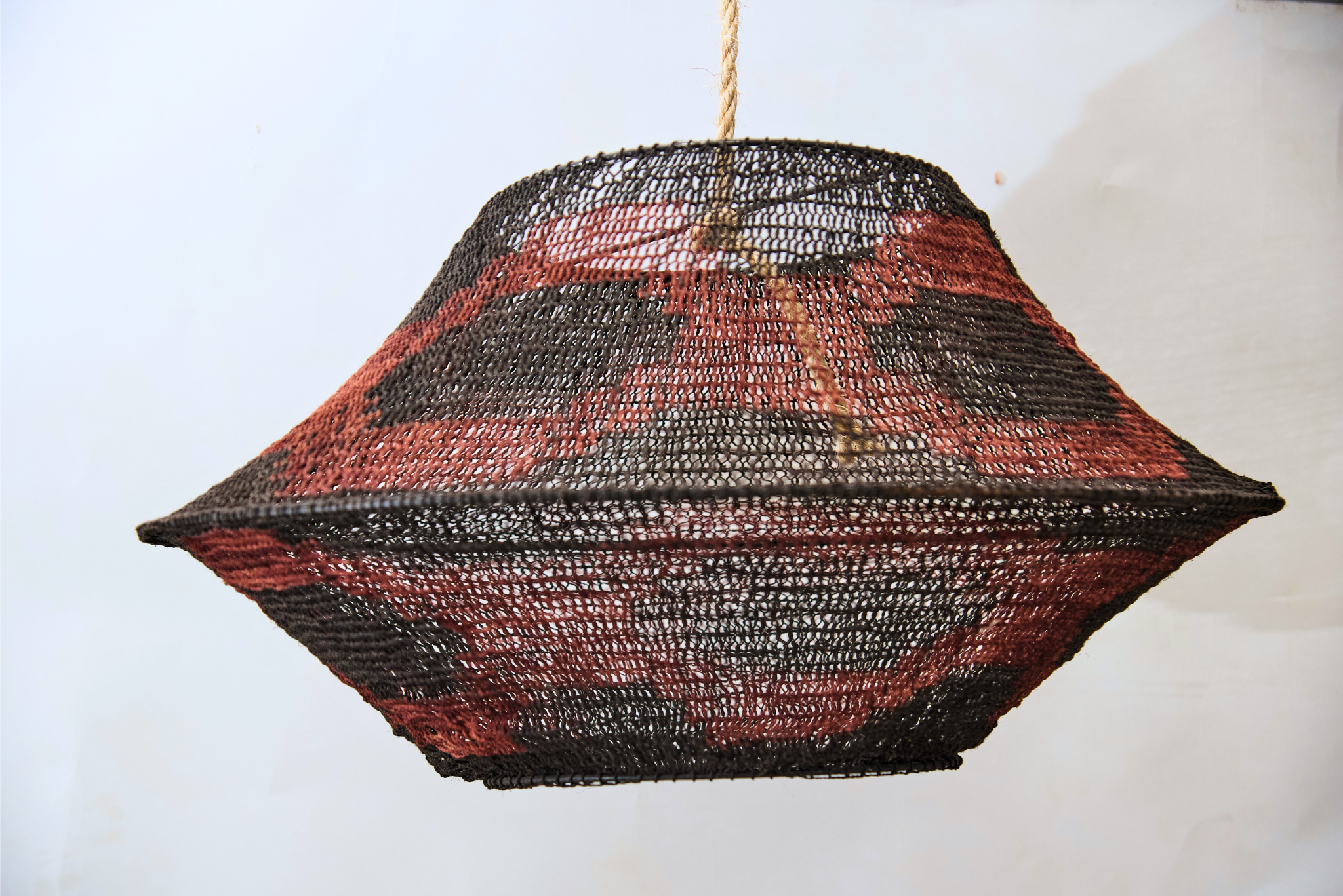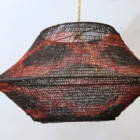 Lámpara de diseño intenso y elegante, tejida a mano en caraguatá. Cada pieza es irrepetible y transmite fuerza visual.