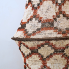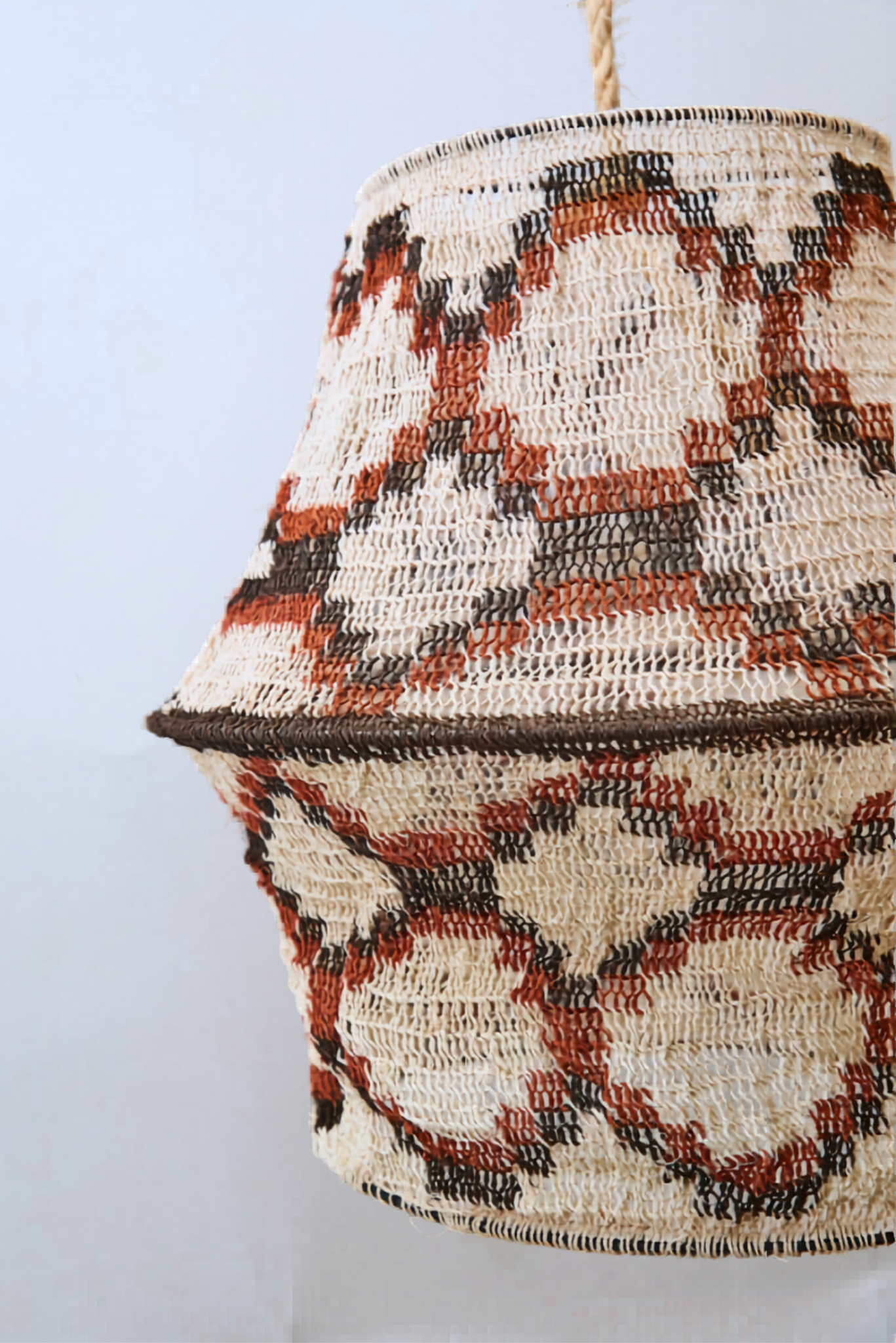 Tejida a mano en caraguatá, esta lámpara combina una base clara con detalles en rojo y negro, logrando un equilibrio entre suavidad y carácter. Cada pieza es irrepetible, con variaciones propias del trabajo artesanal.