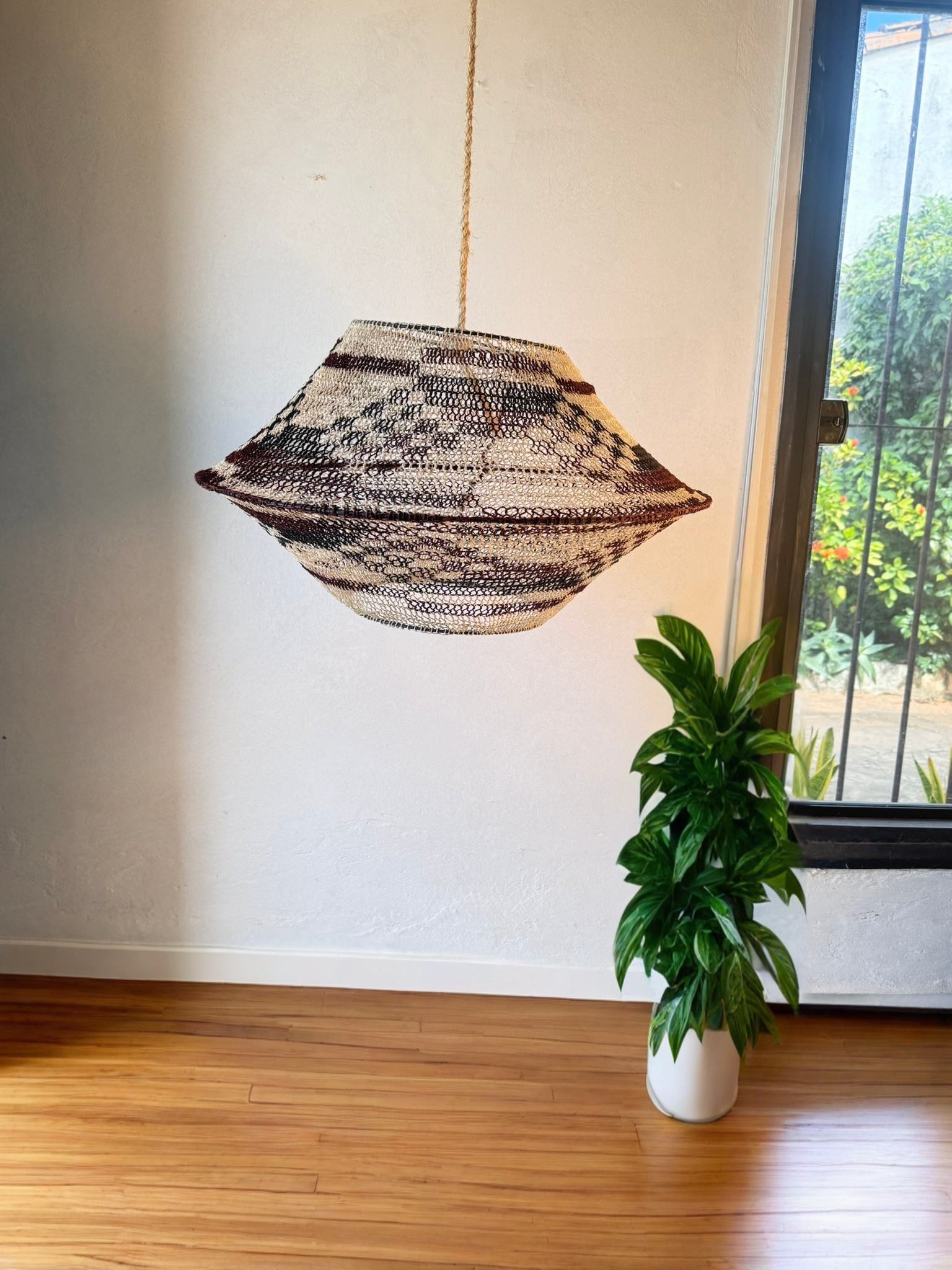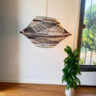 Lámpara colgante artesanal de caraguatá con entramado de contrastes naturales. La combinación de fibras claras y oscuras genera un juego de luces y sombras más marcado, aportando profundidad visual al espacio.