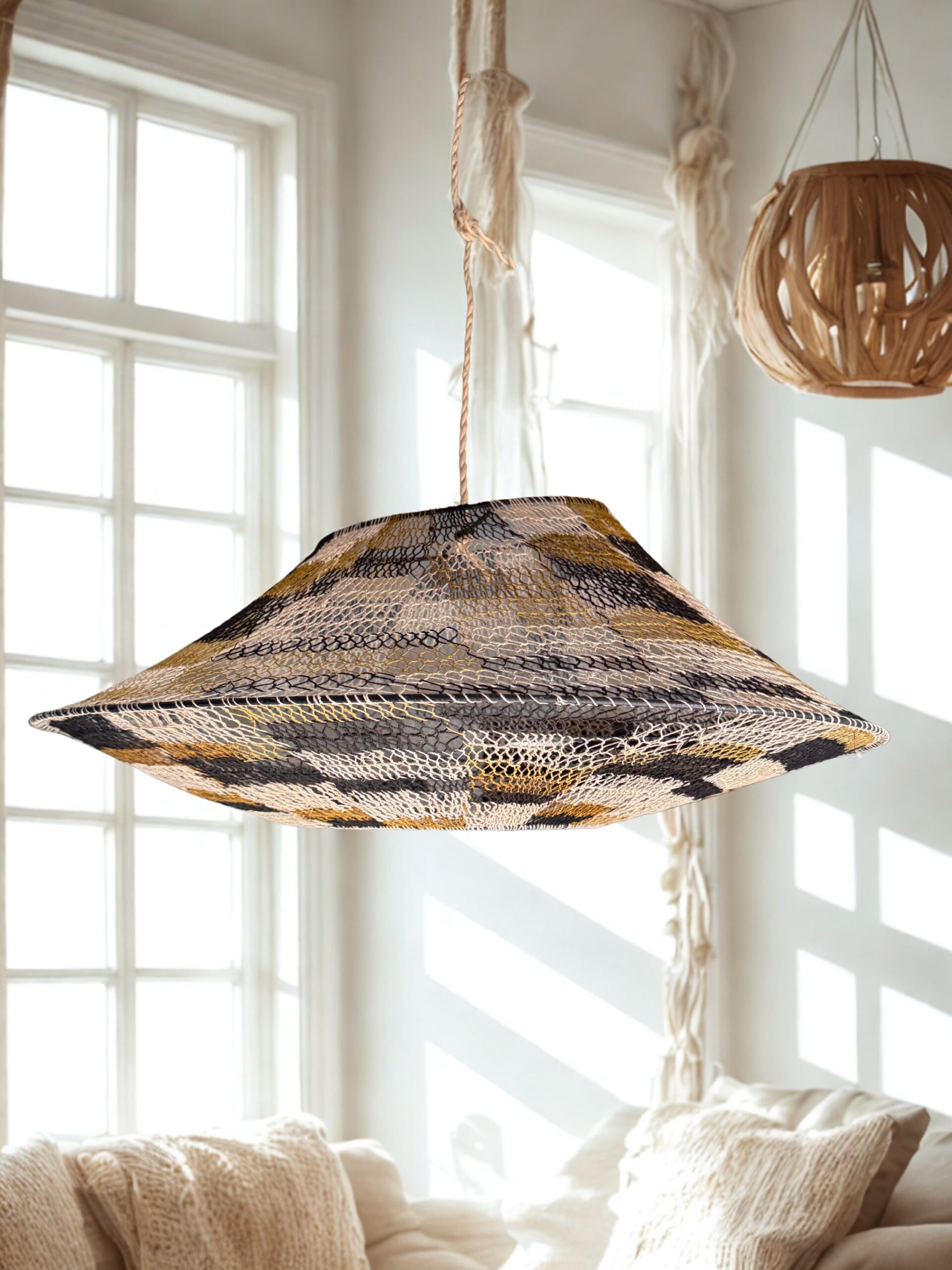 Con una medida de 80cm y un diseño versátil, esta lámpara se adapta a diferentes estilos de decoración: moderna, rústica, minimalista o bohemia. Su estructura permite integrarla fácilmente en cualquier ambiente, aportando textura, calidez y autenticidad.