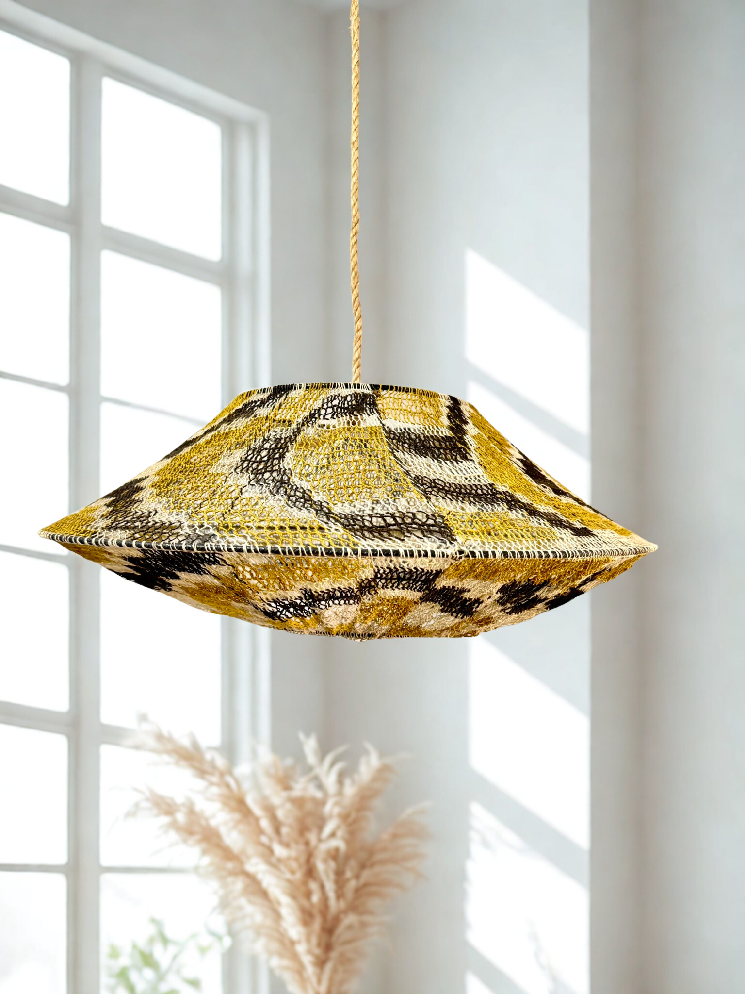 Con una medida de 60cm y un diseño versátil, esta lámpara se adapta a diferentes estilos de decoración: moderna, rústica, minimalista o bohemia. Su estructura permite integrarla fácilmente en cualquier ambiente, aportando textura, calidez y autenticidad.