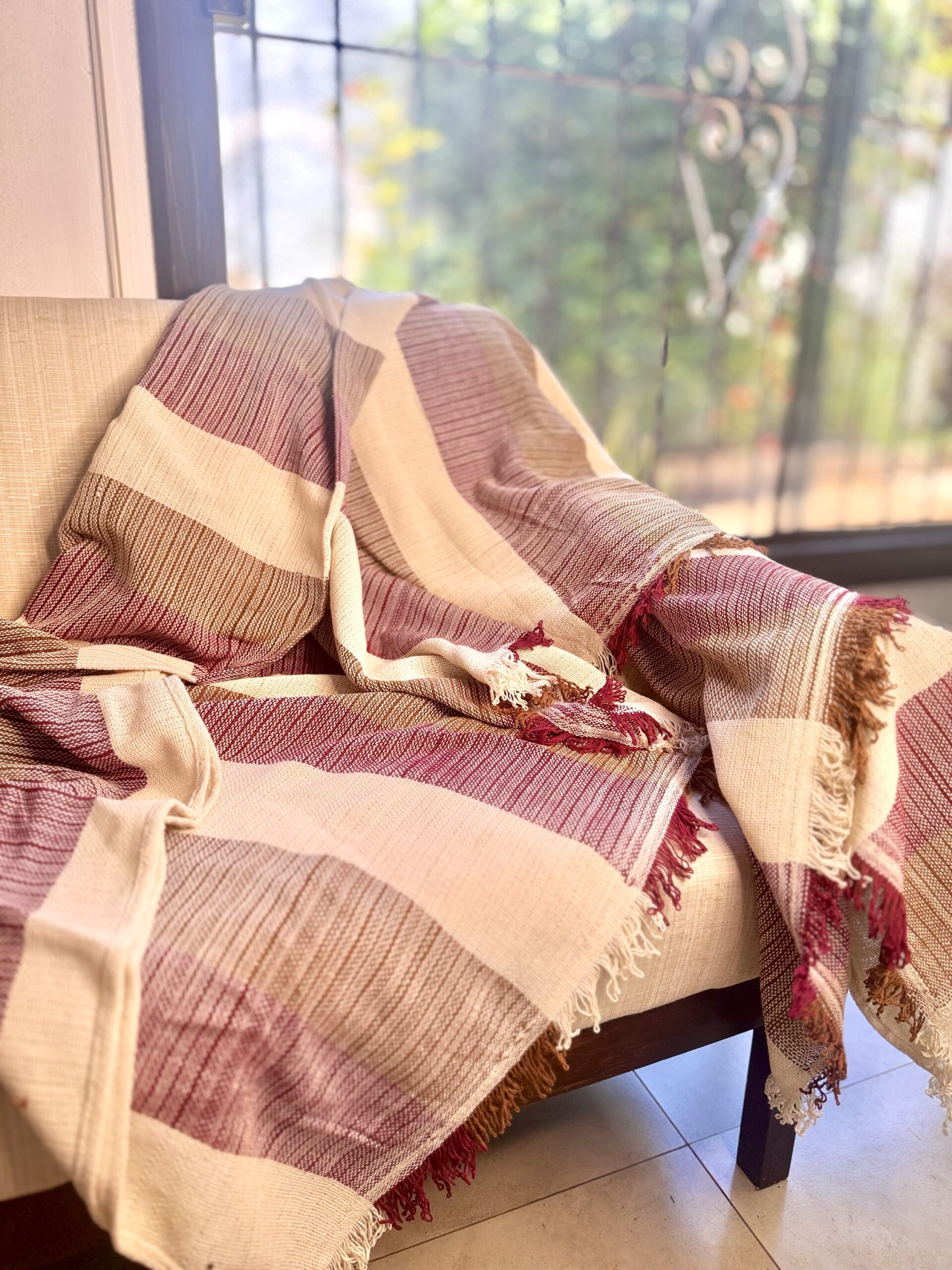Manta artesanal de algodón hecha a mano en telar, con hilos 100% de algodón natural. Suave, cálida y resistente, esta manta de 1,60 x 2,50 es perfecta para usar en el sofá, la cama o como detalle decorativo en cualquier rincón de tu hogar.
