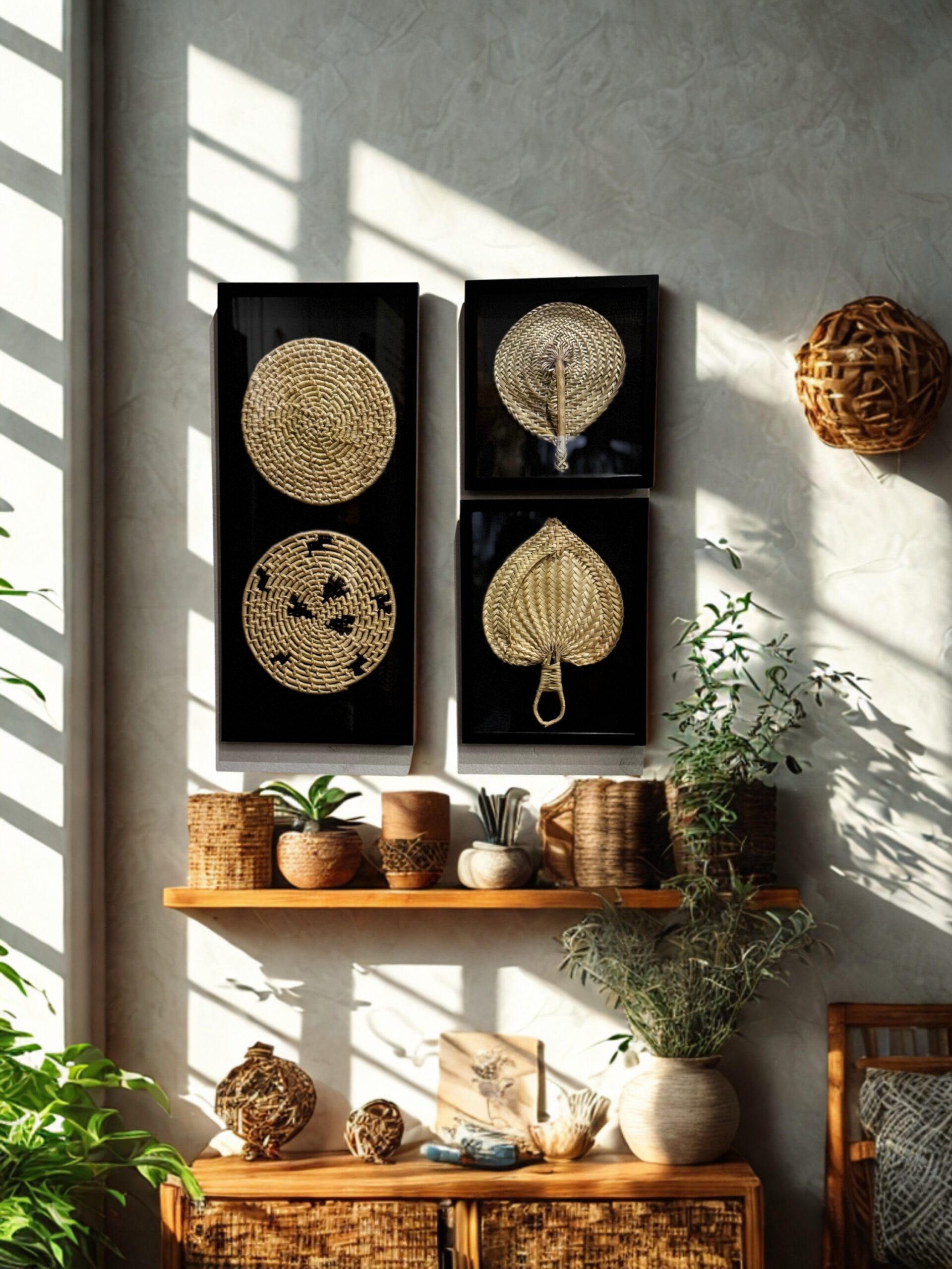 Dale calidez y textura natural a tus espacios con este set de cuadros decorativos de karanday, hechos a mano por artesanos paraguayos. Cada pieza está elaborada con fibras naturales de karanday, cuidadosamente tejidas y enmarcadas para resaltar su belleza única.