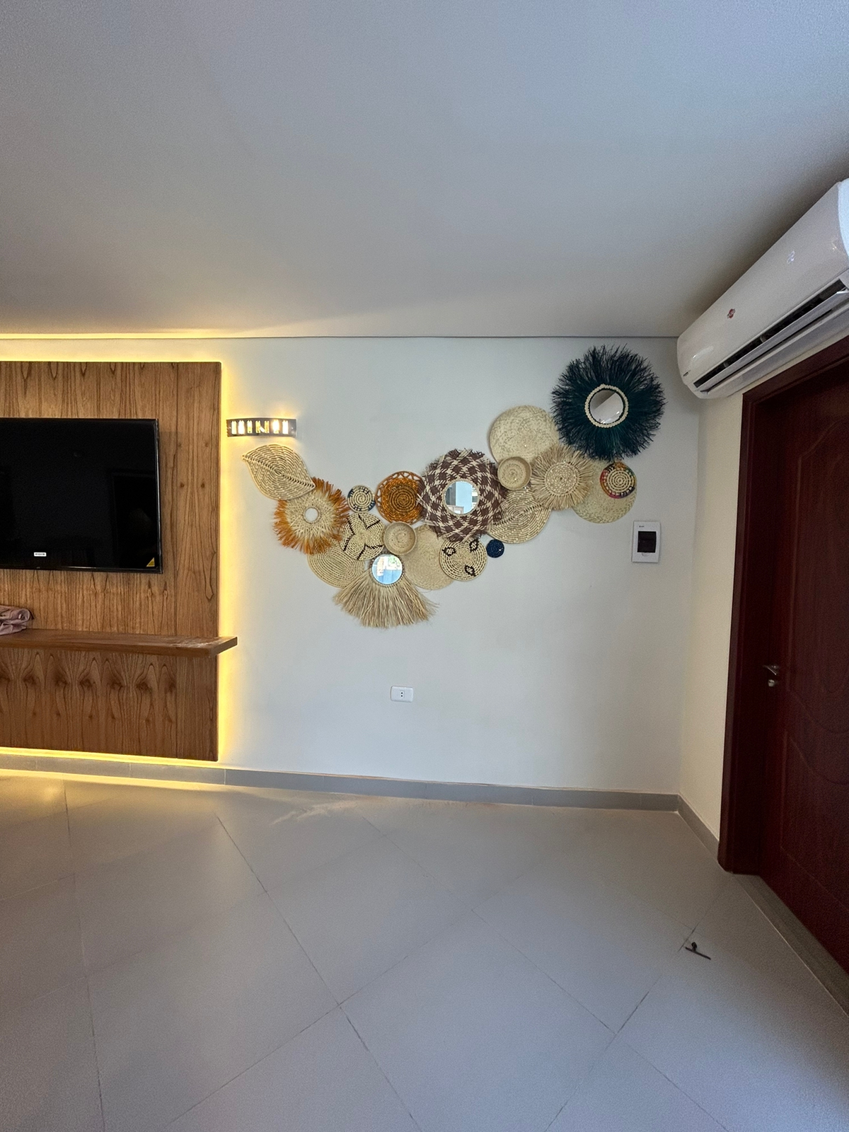 Este mural artesanal es una verdadera obra de arte hecha a mano, compuesto por varias piezas que, al unirse, forman una imponente decoración de 2metros aproximadamente de largo. Cada detalle está trabajado con fibras naturales en tonos beige, naranja y marrón, lo que aporta calidez, armonía y un estilo orgánico a cualquier ambiente.