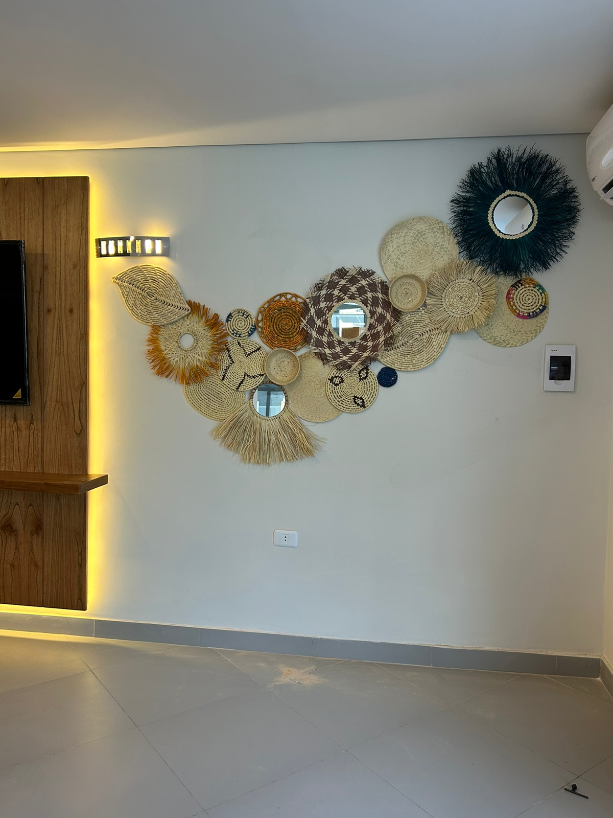 Ideal para quienes buscan decoración artesanal de gran formato, este mural no solo embellece, sino que también cuenta una historia: la del trabajo paciente de artesanos que transforman fibras en arte. Una pieza única que realza la identidad cultural y da un toque exclusivo a la decoración de interiores.